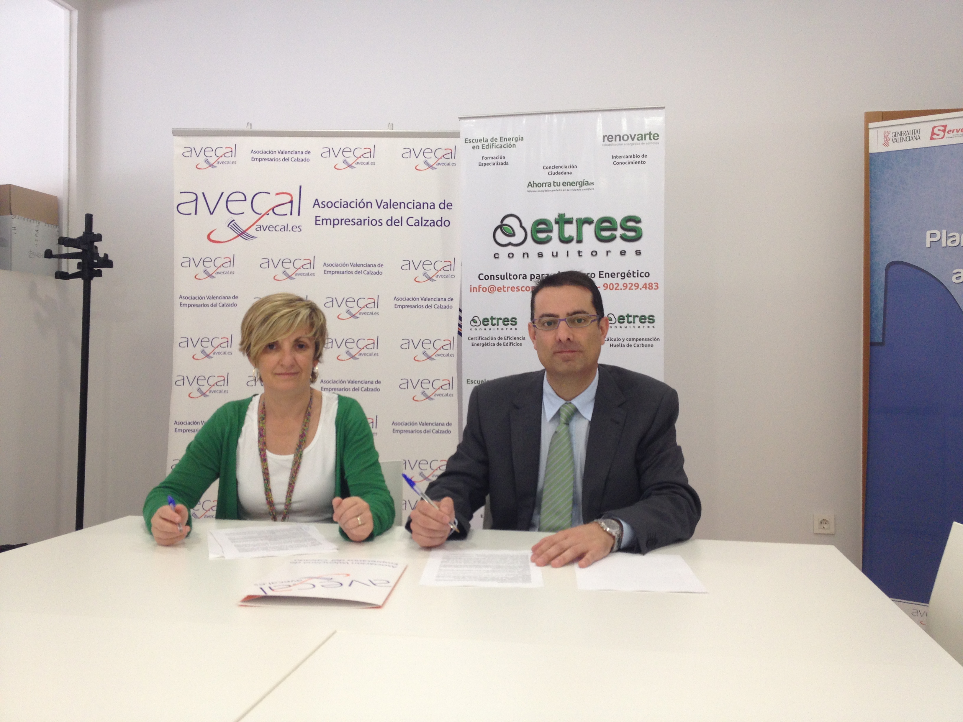 La Asociación Valenciana de la Industria del Calzado representada por Marian Cano, secretaria general de AVECAL y ETRES Consultores representada por Manuel Romero, se han reunido en la sede de AVECAL para firmar el nuevo convenio que facilitará el ahorro energético y la reducción y compensación de las emisiones de gases de efecto invernadero de las empresas asociadas.