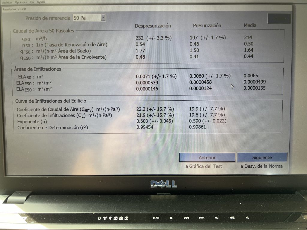 En el caso de esta vivienda unifamiliar en Crevillente, nuestro equipo de profesionales realizó el ensayo Blower Door para verificar la estanqueidad al aire de la vivienda. El resultado fue muy satisfactorio, ya que se comprobó que todas las ventanas estaban bien cerradas y todas las juntas se encontraban selladas mediante una membrana líquida en color negro, conocida como Soudal. Cabe destacar que el valor límite de renovaciones en Passivhaus es de 0,64 [1/h] y en este caso nos encontrábamos ante un valor de 0,50 [1/h], algo excepcional que muy pocas veces se consigue. Este aspecto es muy positivo, y es una gran novedad en este ensayo.
